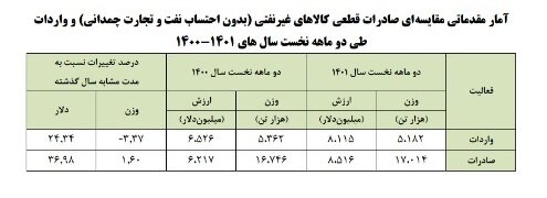 به گزارش خبرنگار اقتصادی ایرنا، مطابق جدول آماری گمرک در دوماهه نخست سال ۱۴۰۱، میزان صادرات قطعی کالاهای غیرنفتی کشور (بهاستثنای نفت خام، نفت کوره، نفت سفید و همچنین بدون صادرات از محل تجارت چمدانی)، بالغ بر ۱۷ هزار و ۱۴ تن کالا به ارزش هشت میلیارد و ۵۱۶ میلیون دلار بوده است که در مقایسه با مدت مشابه سال ۱۴۰۰، افزایش ۱.۶ درصدی در وزن و ۳۷ درصدی در ارزش داشته است.